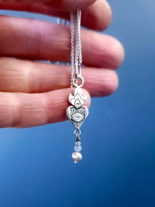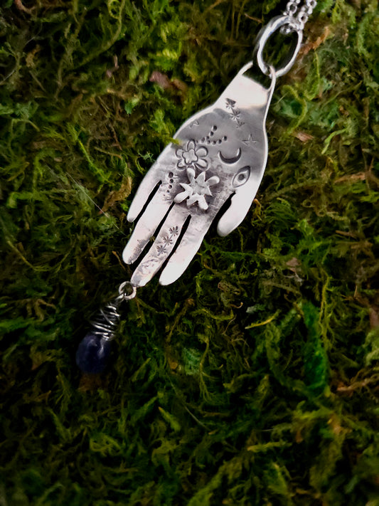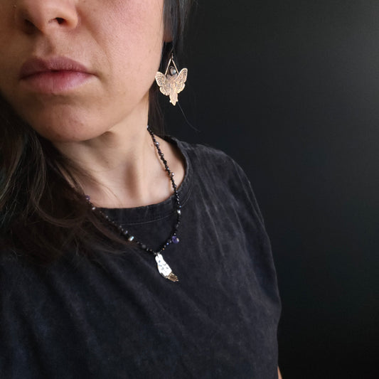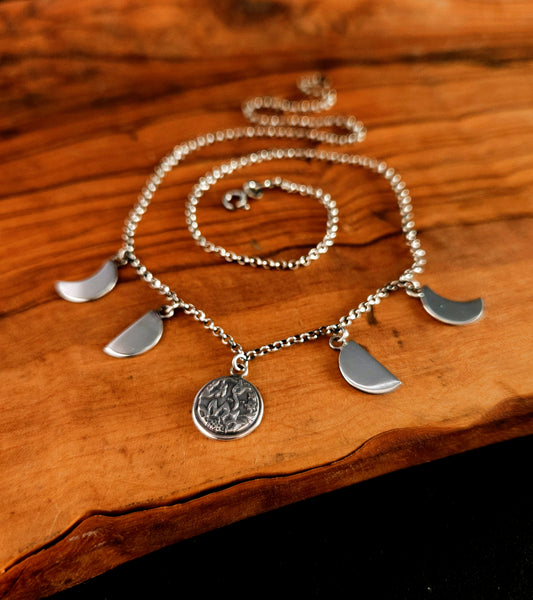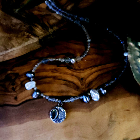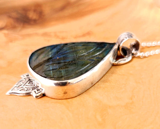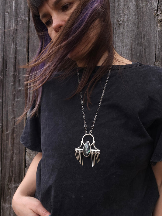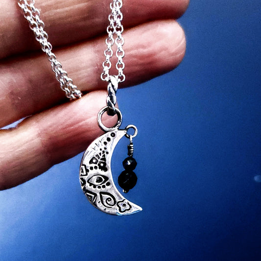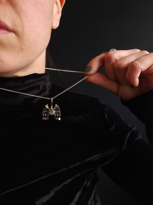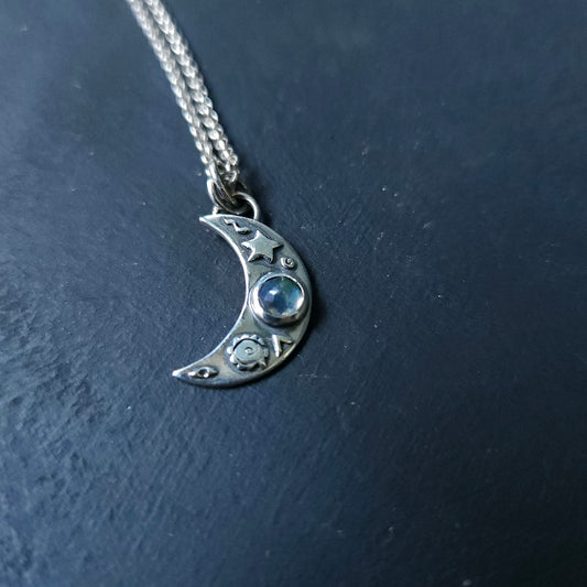 Pendentif Lune en argent sterling avec labradorite – symboles soudés à la main