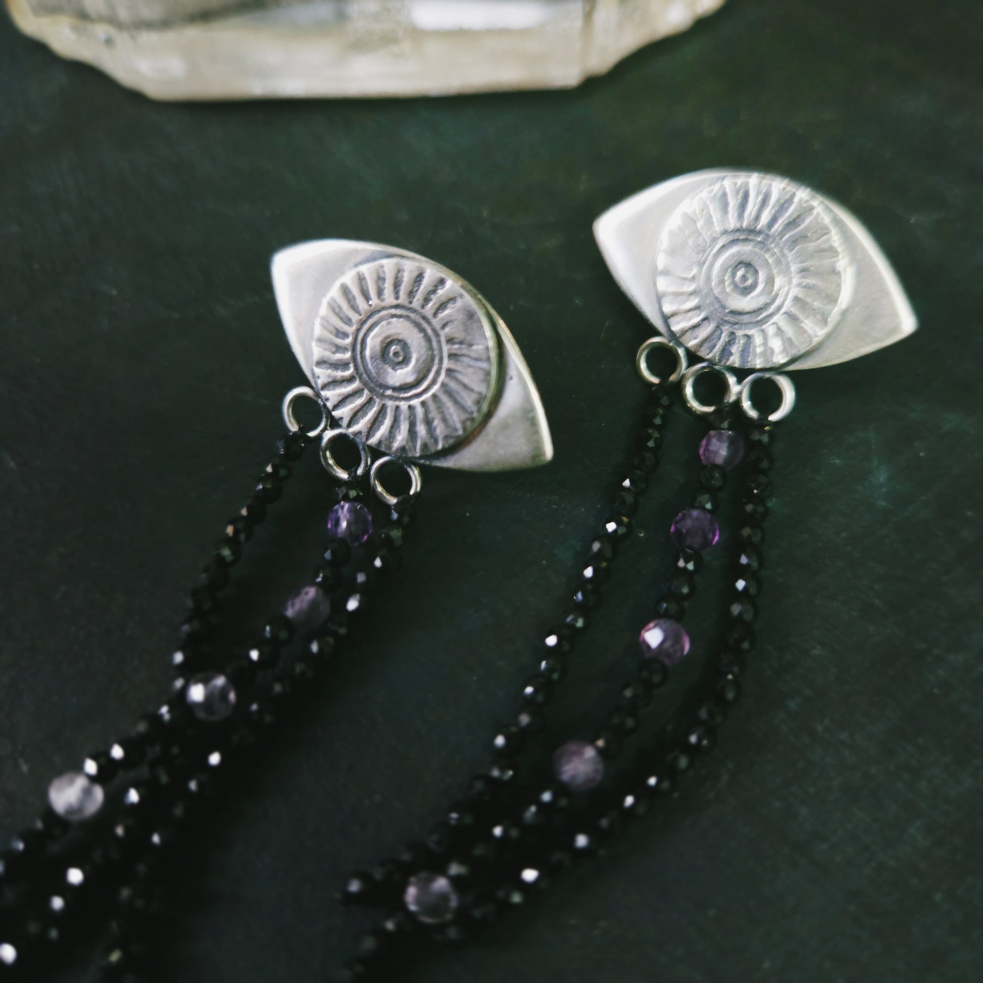 Construit et texturé en argent sterling, l’œil surplombe trois chutes délicates de perles d’onyx et de fluorite — deux pierres opposées et complémentaires :