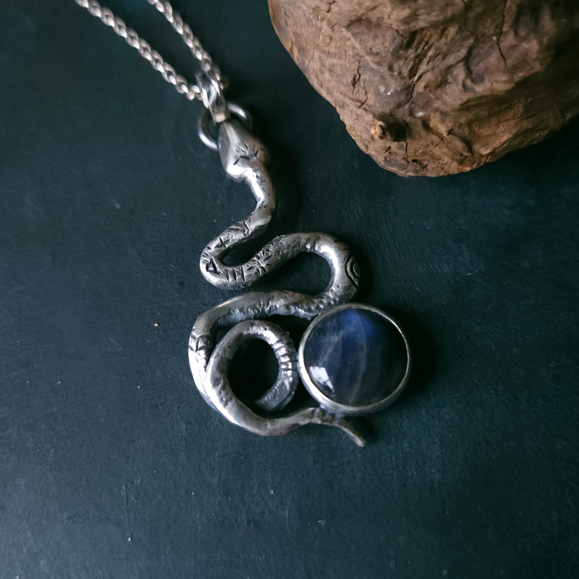 Collier serpent en argent fusionné avec labradorite – bijou symbolique, pièce unique